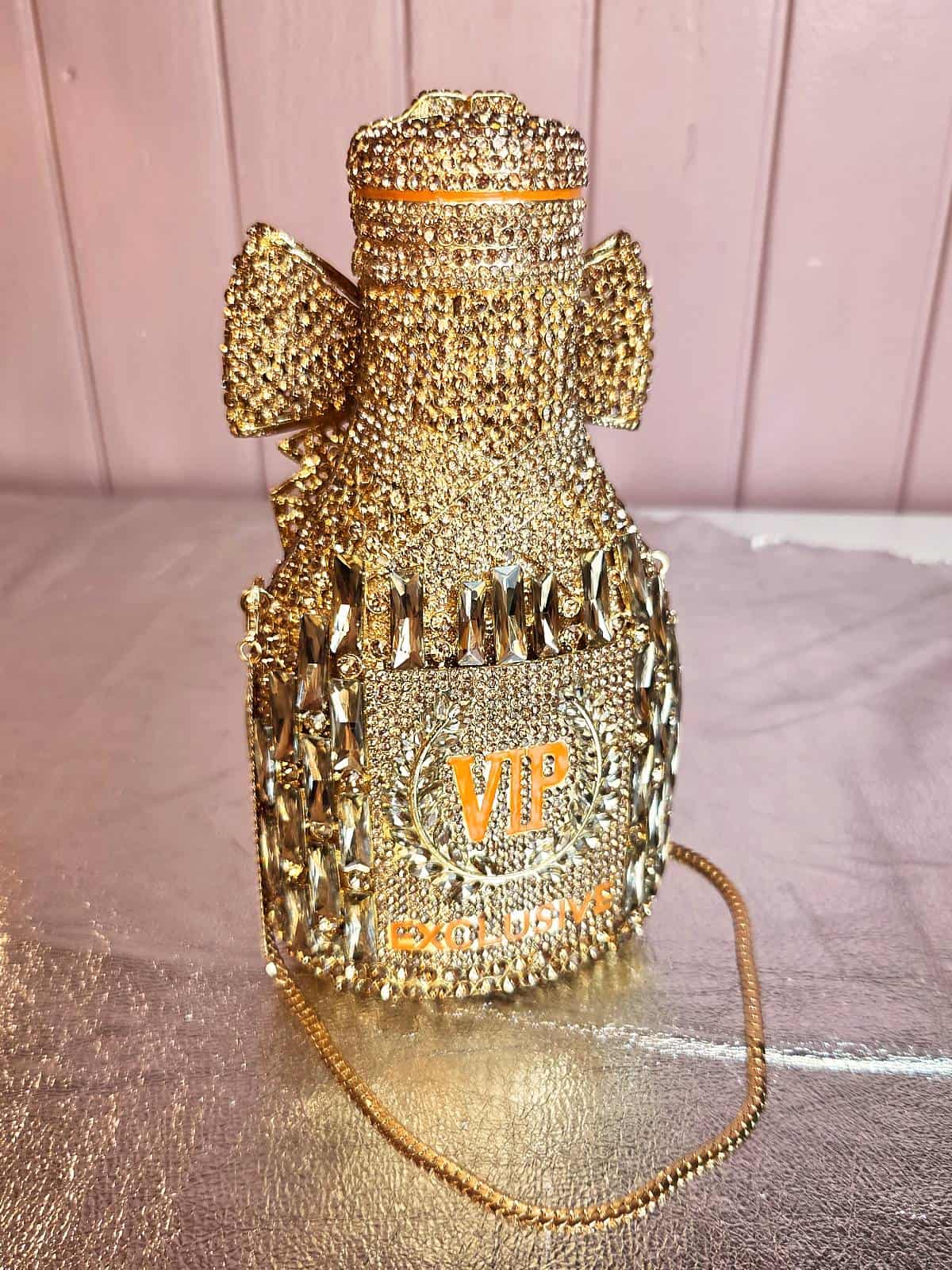 Metalclutch formet som en lommeflaske med teksten VIP EXCLUSIVE på. Clutchen er dækket af store og små funklende similisten i guld, for et eksklusivt look.