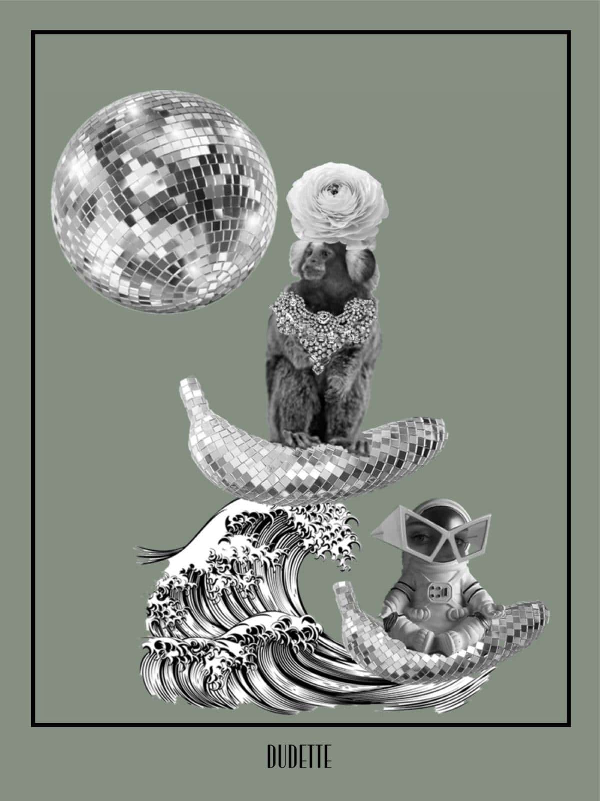 Dudette poster med en glamourøs lille abe, der surfer på en disco-banan, sammen med en lille rummand.