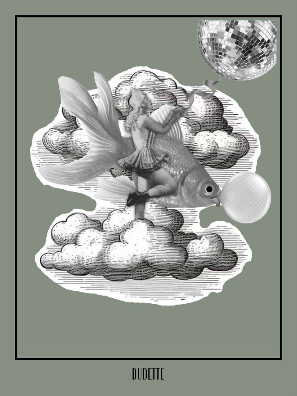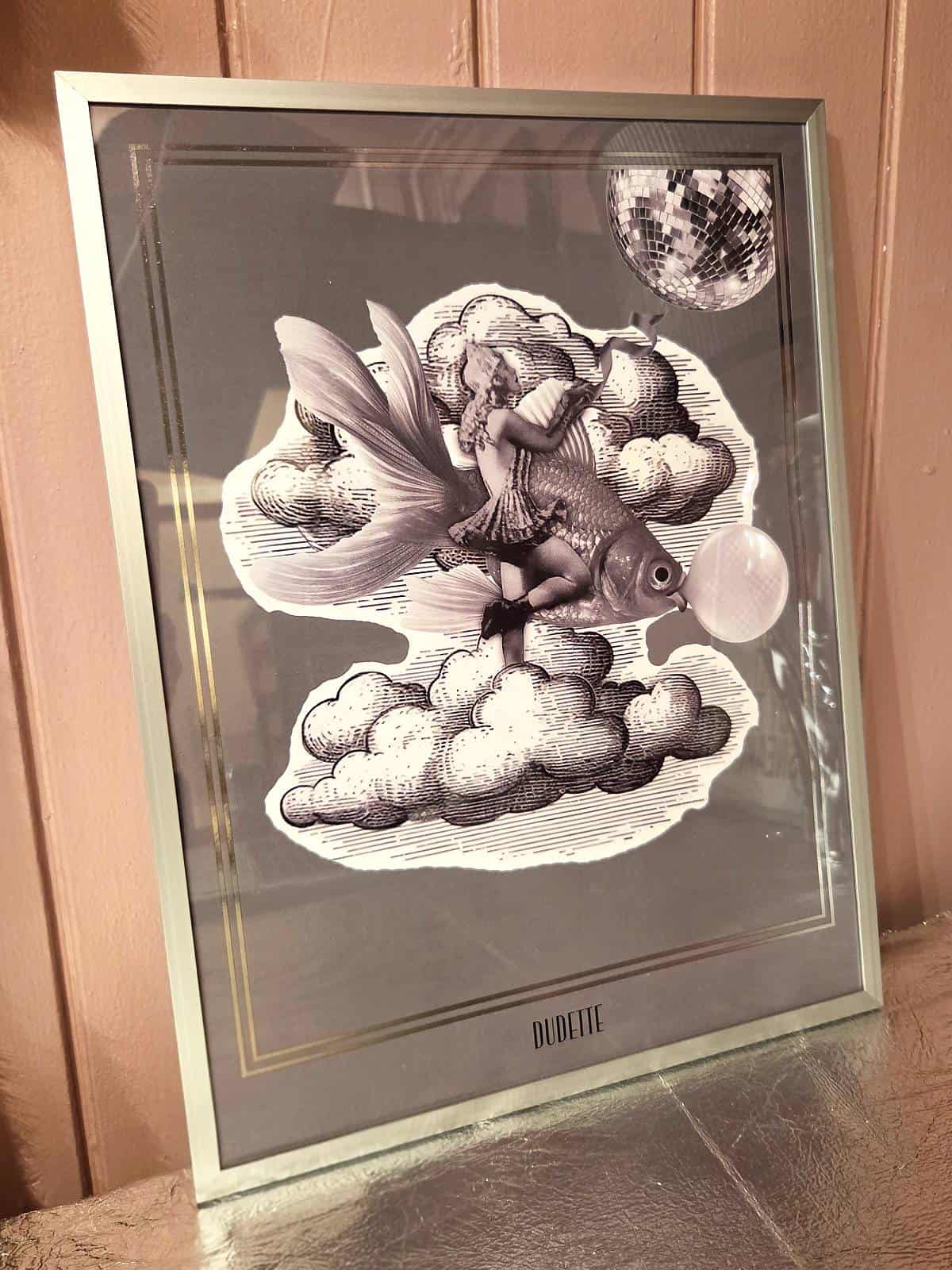 Dudette poster med en guldfisk der blæser en tyggegummiboble, mens den flyver i skyerne.