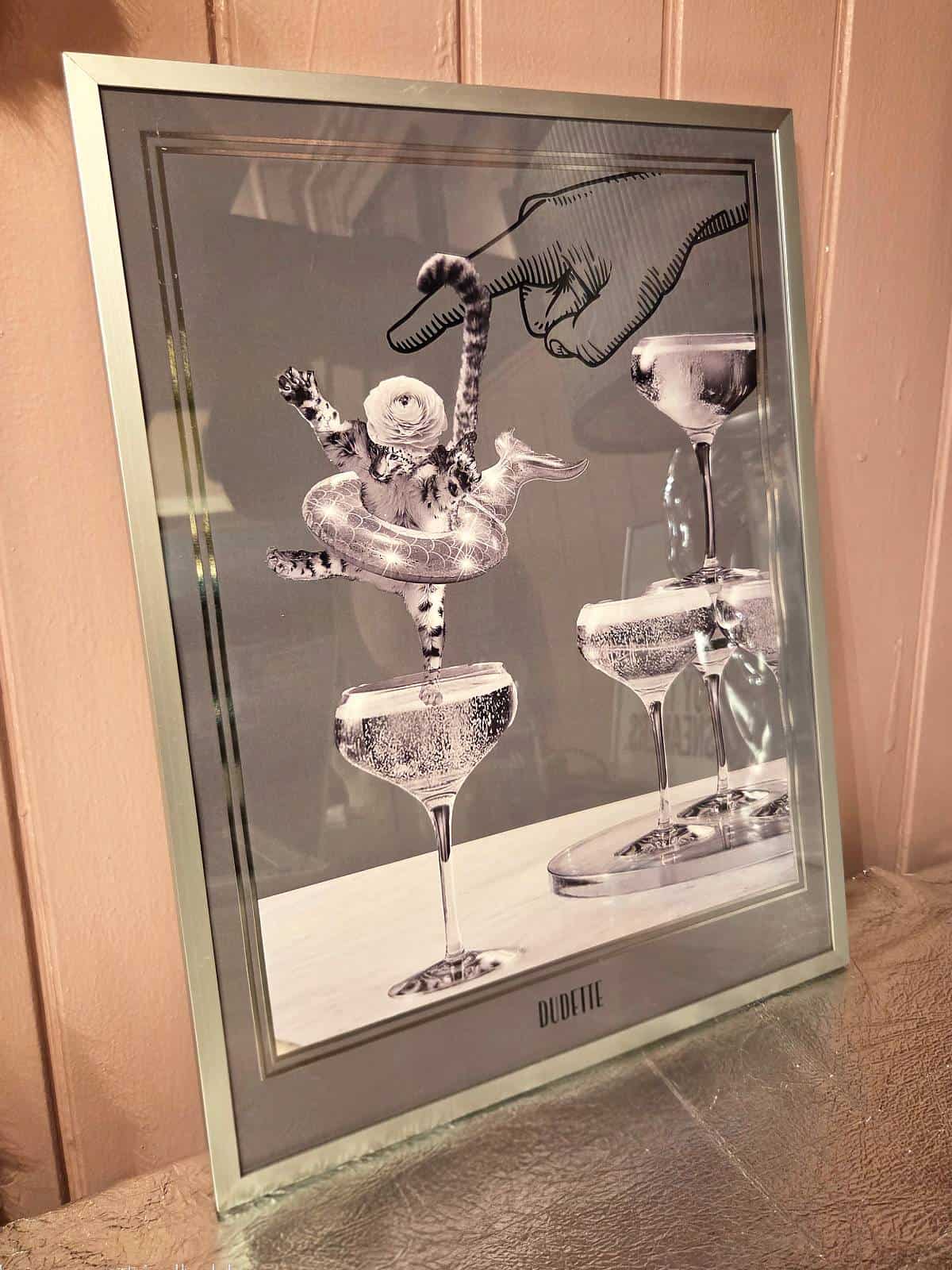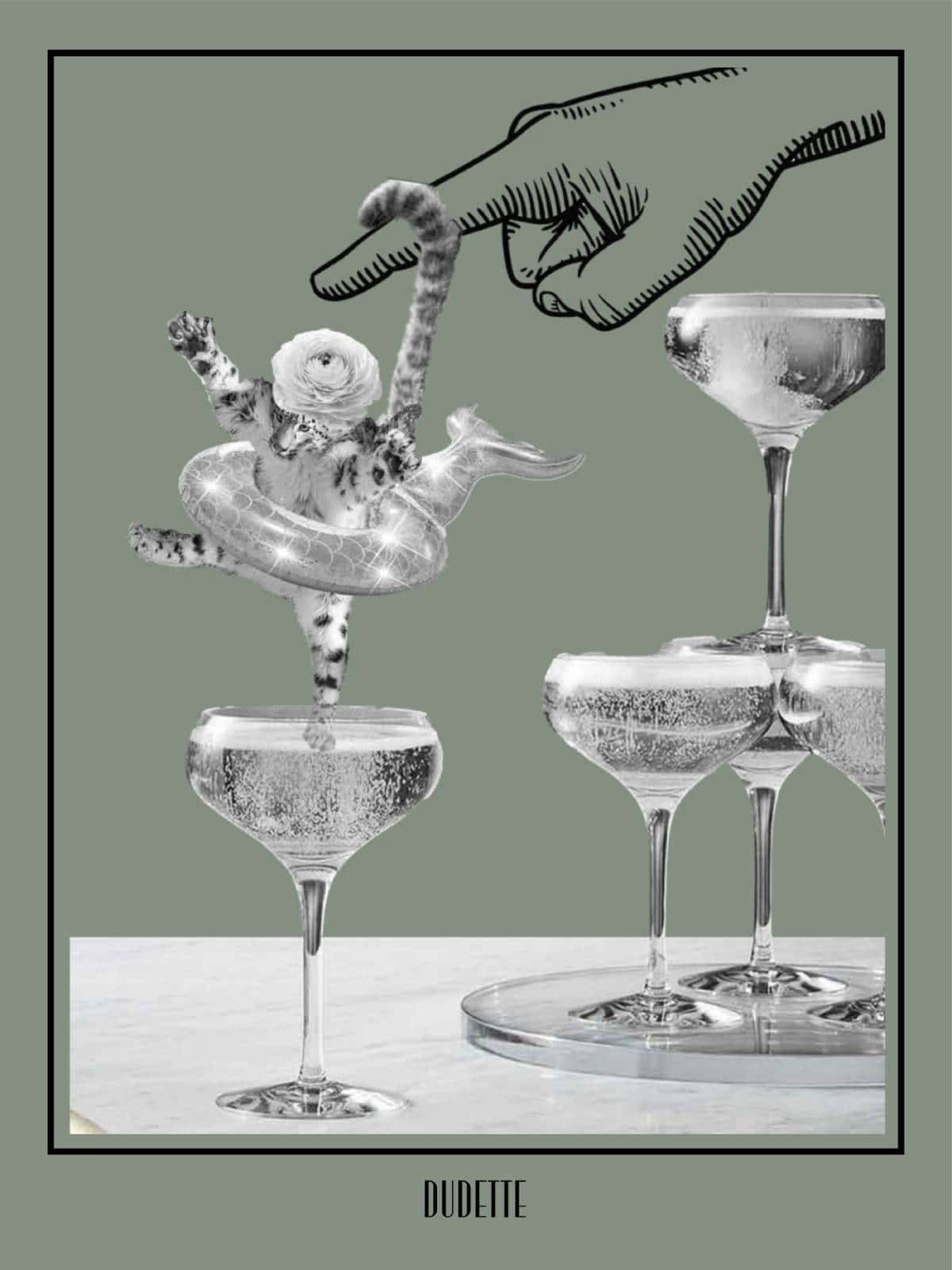 Dudette poster med en tiger med en havfruebadering på, der springer ned i et champagneglas.