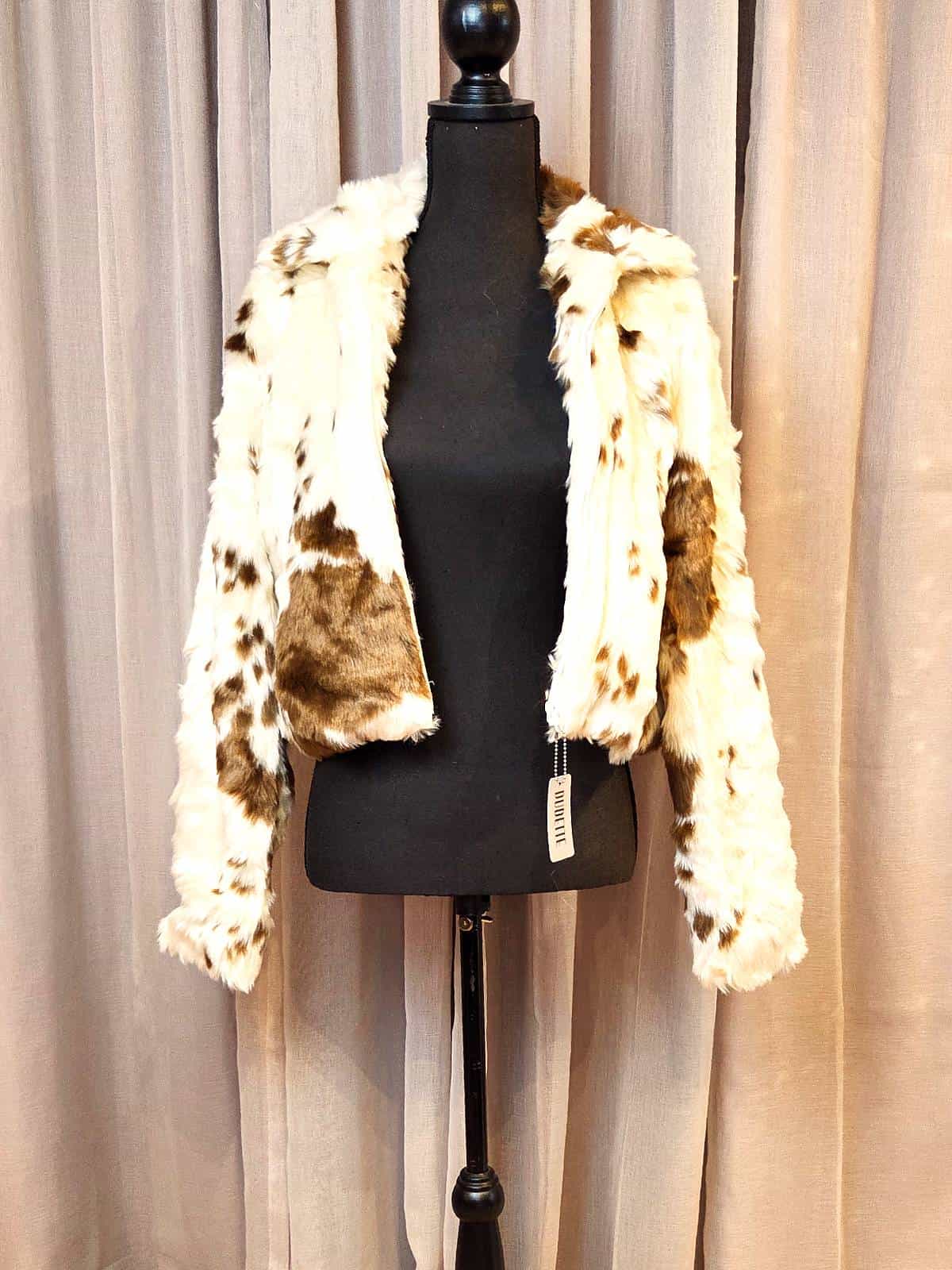 Kort faux fur Cow pelsjakke med lynlås, med smukt, naturligt inspireret ko-mønster i brun og hvid.