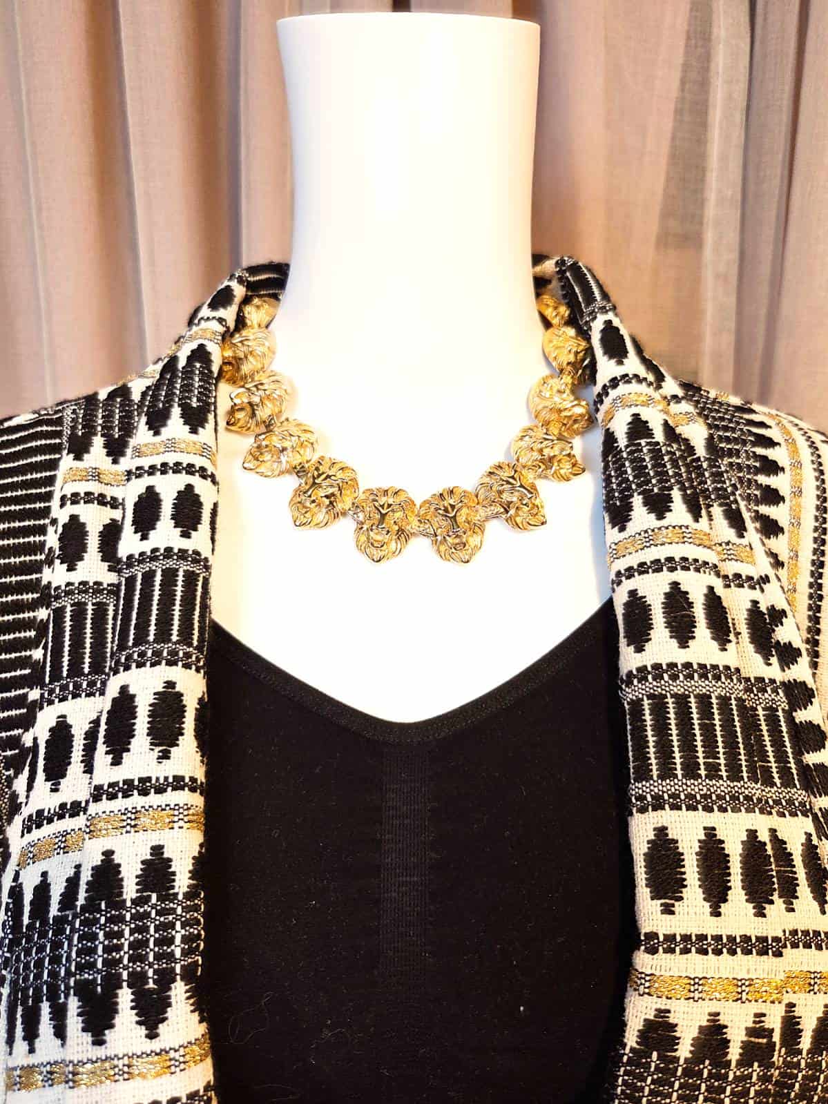 Lang håndvævet kåbe i sort/hvid mønster med subtile gulddetaljer. Elegant, åben silhuet – Løst bindebælte medfølger.