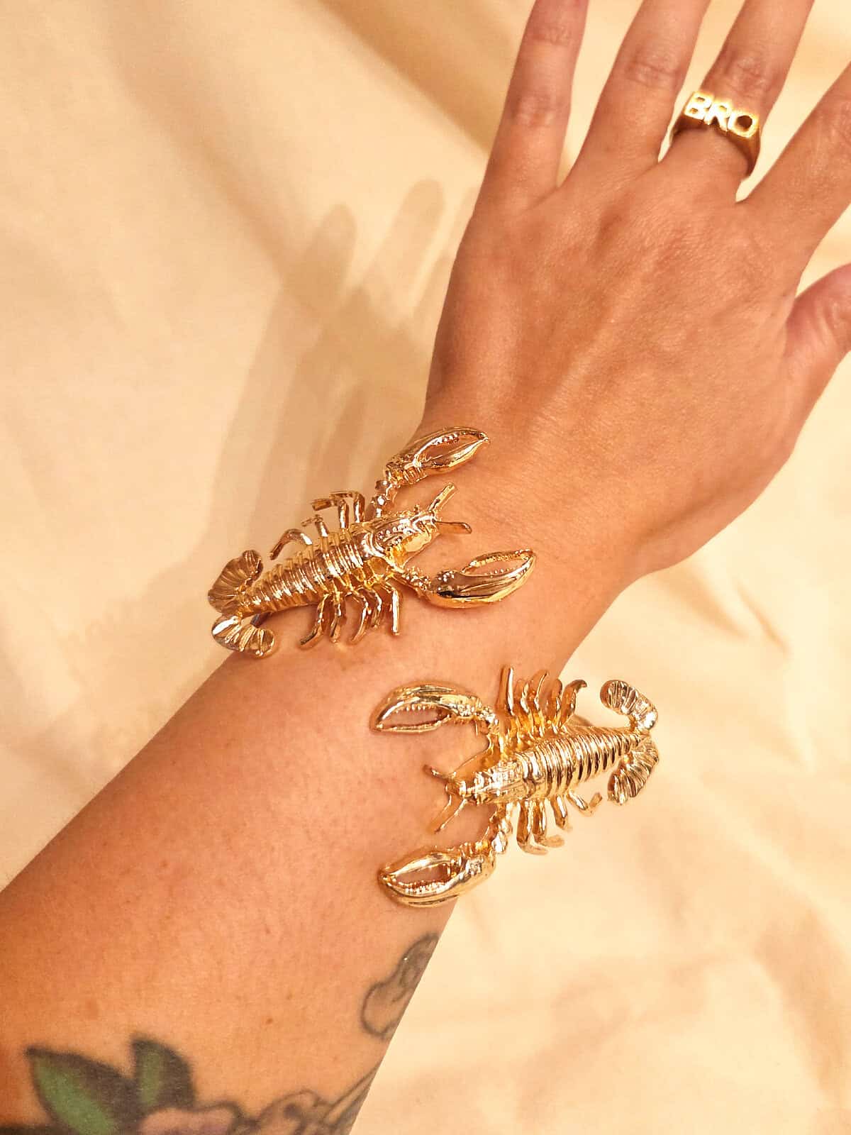 Snoet åbent guldfarvet armbånd med 2 hummere. Unikt armbånd – kun ét stk. på lager