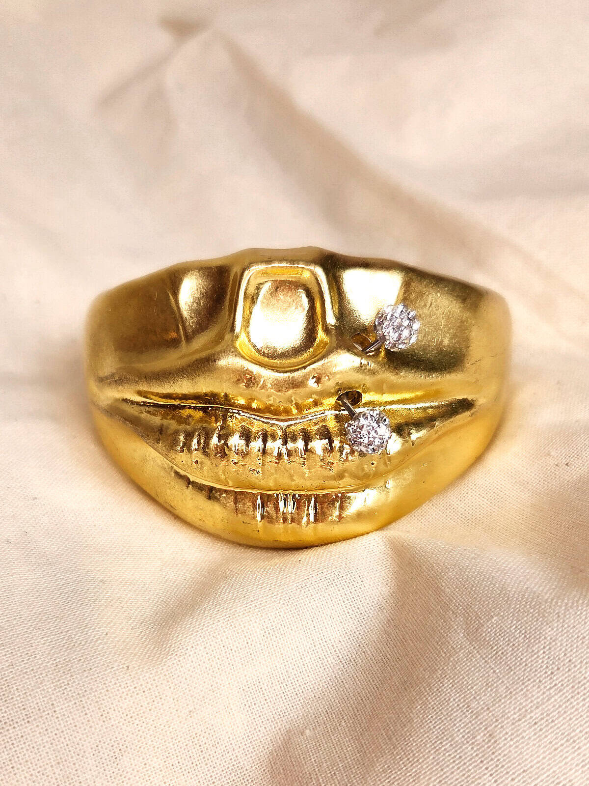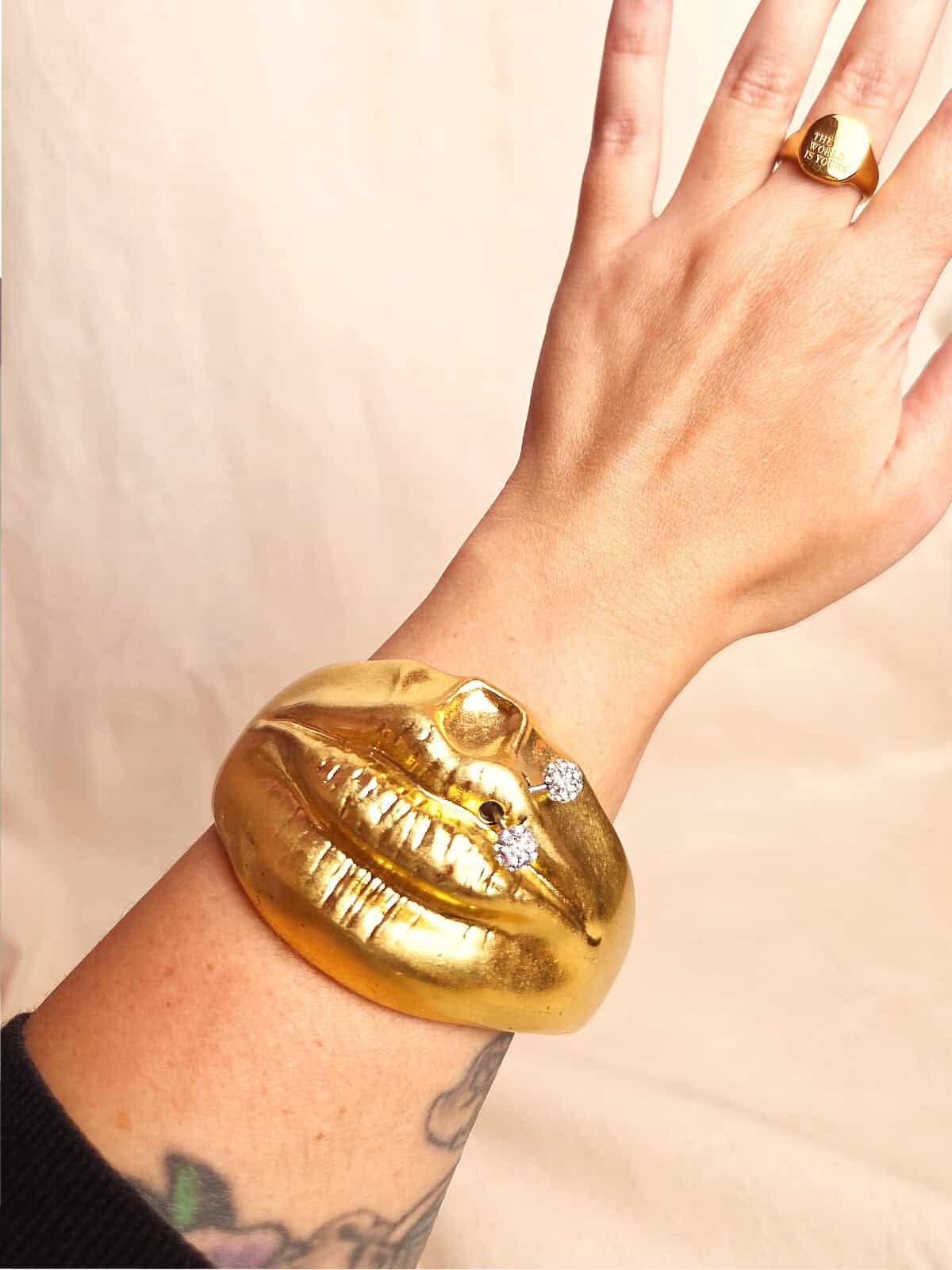 Gyldent armbånd formet som en mund, med piercet læbe. Unikt armbånd – kun ét stk. på lager