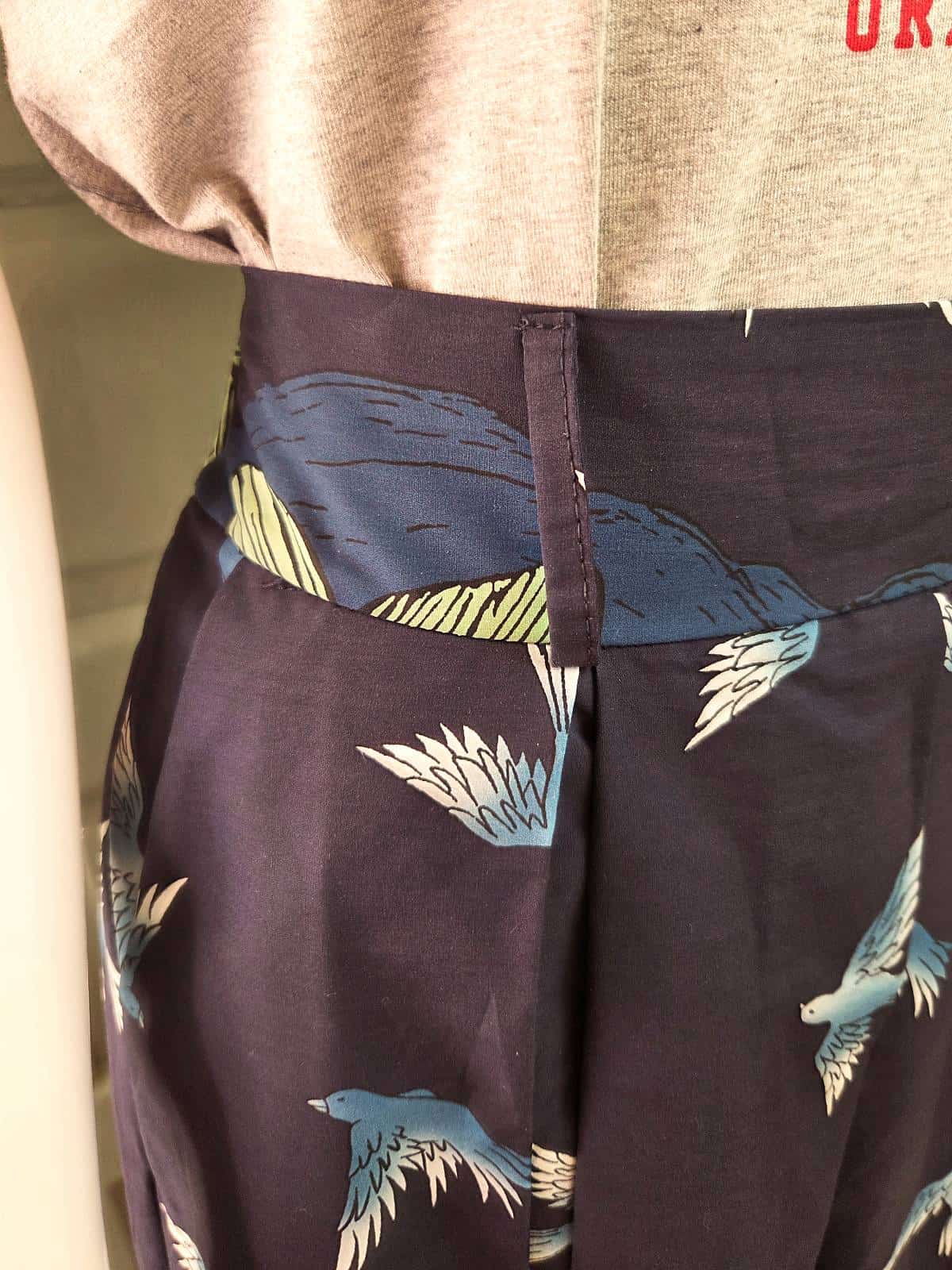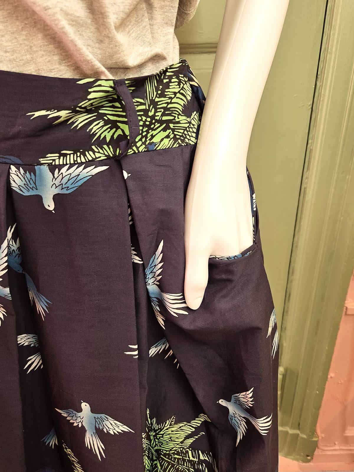 Mørkeblå nederdel med smukke, detaljerede print af leoparder, eksotiske fugle og frodig natur.
