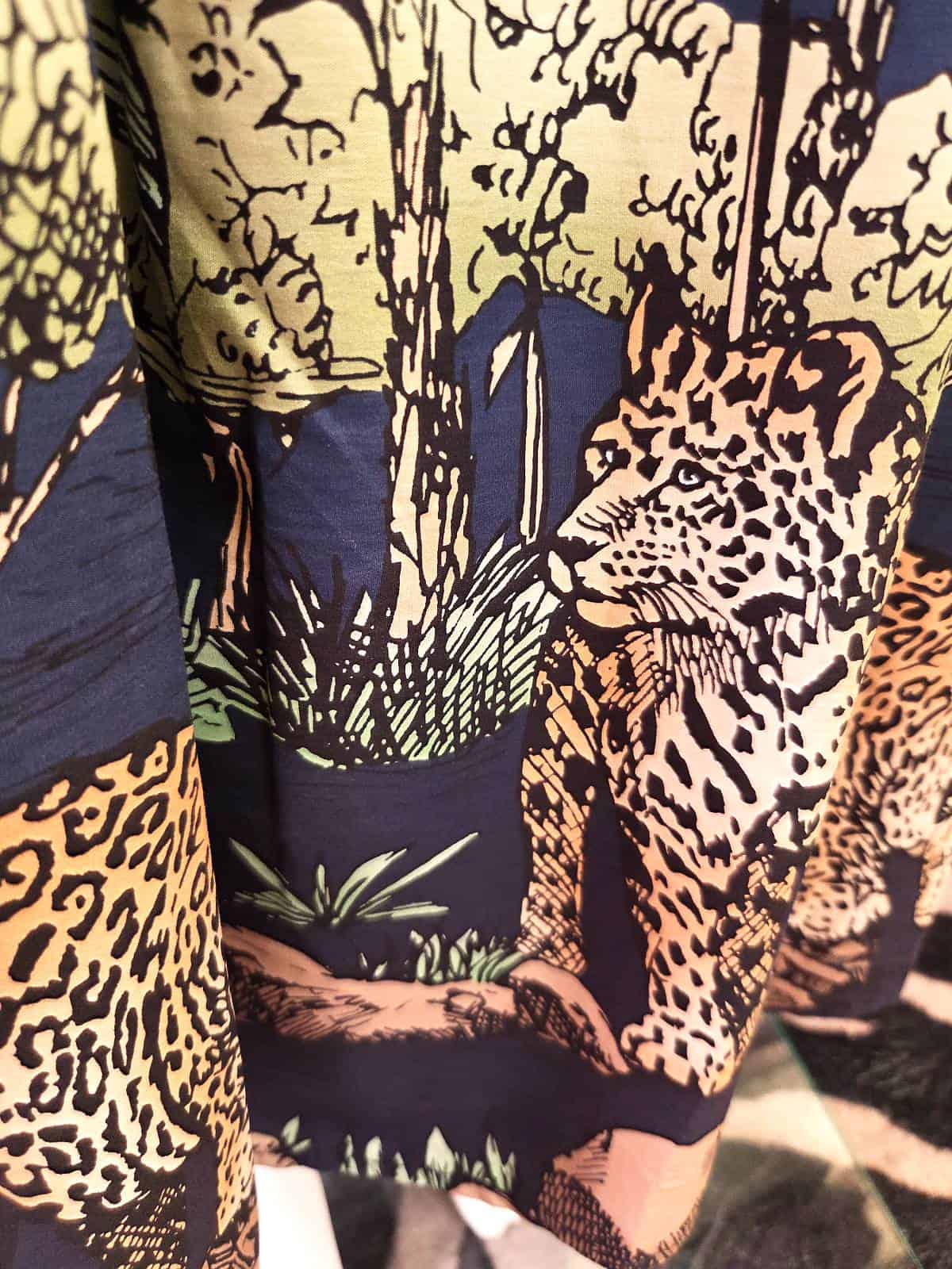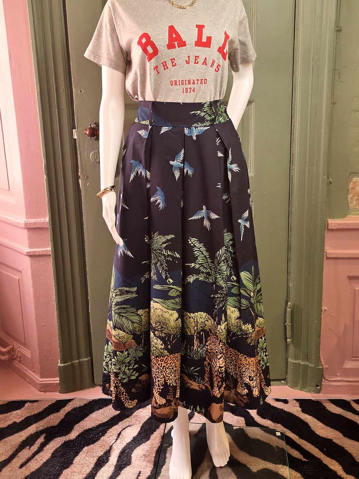 Denne mørkeblå A-formede nederdel bringer junglens magi direkte ind i din garderobe. Med smukke, detaljerede print af leoparder, eksotiske fugle og frodig natur kombinerer den elegance med eventyr. Perfekt til både hverdagsbrug med en T-shirt og til festlige anledninger med en silkebluse. Et ægte statement-piece, der får dig til at skille dig ud – på den bedste måde!