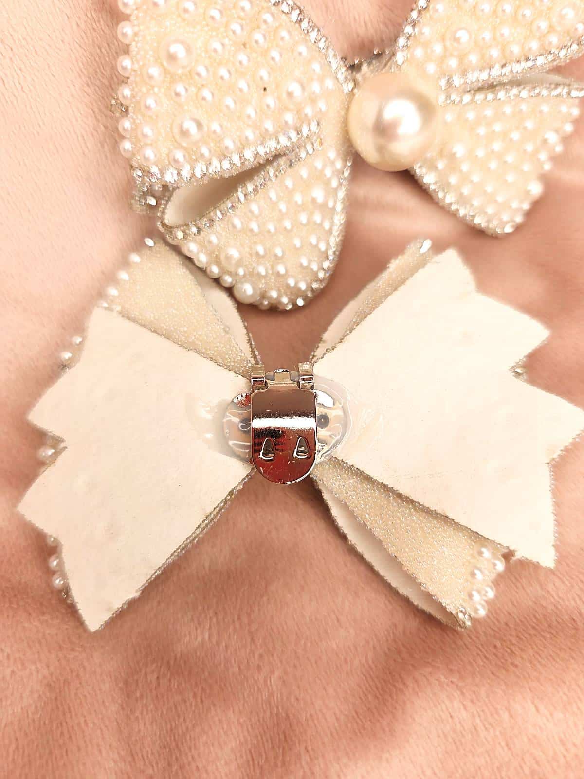 Forvandl dine sko på få sekunder med disse glamourøse clips! Disse cremefarvede sløjfer i filt dekoreret med hvide perler, glimter smukt i lyset og giver selv det enkleste fodtøj et luksuriøst løft.