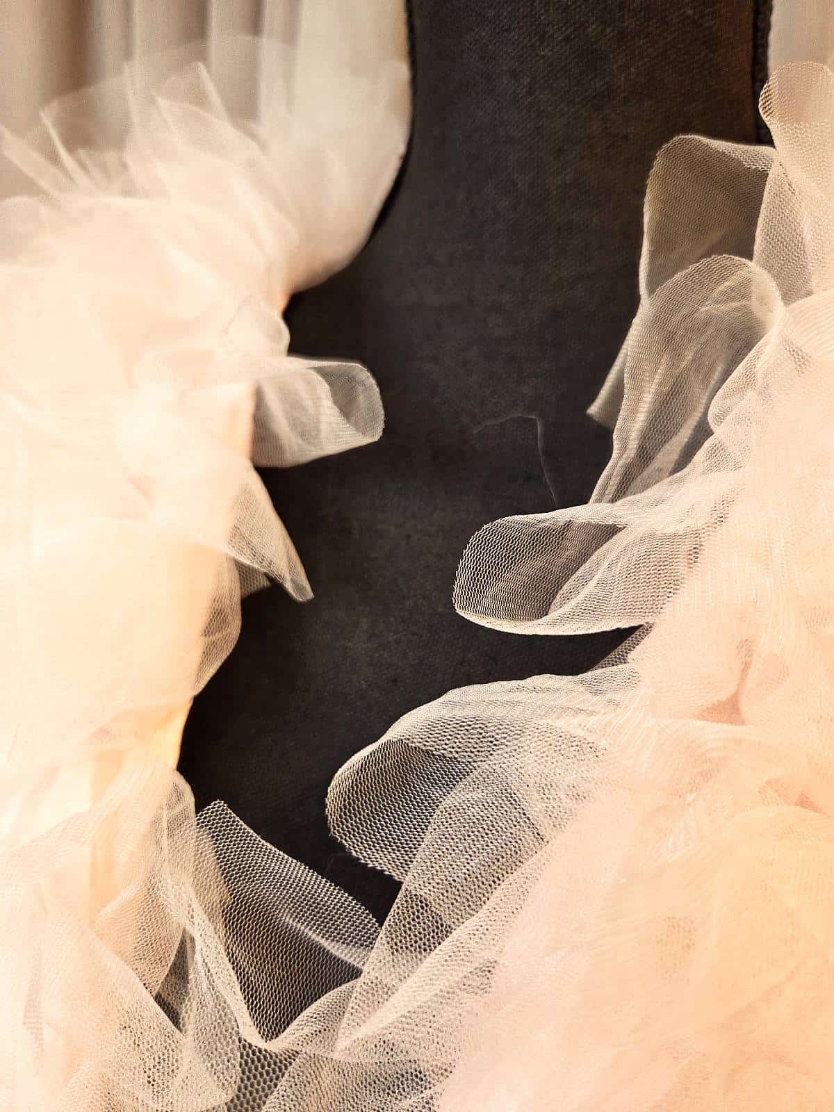 Denne lyserøde tyl bolero jakke er som at hoppe direkte ind i en sky af festlighed. De mange lag af tyl giver volumen og bevægelse.